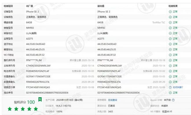 即使配备了配置锁,然而硬件皆是正常状态,举例来说,这台iPhoneSE的验机报告呈现全绿的情况 。