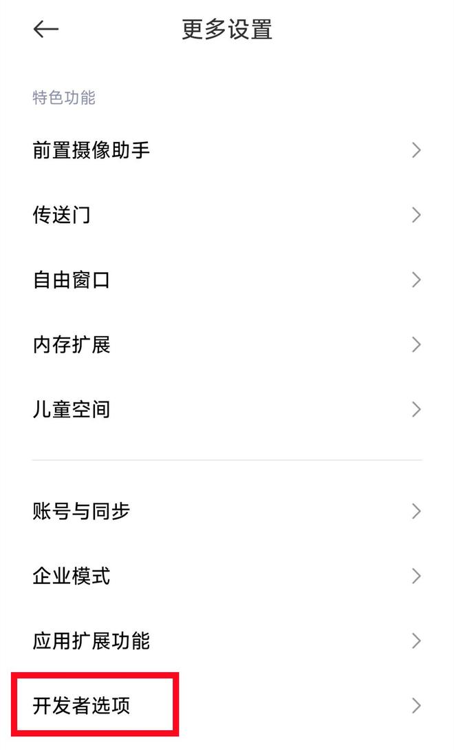 当开发者模式被开启之后,我们再度返回到之前的页面,紧接着去点击更多设置这一按钮,随后便能够看到存在一个名为【开发者选项】的选项,我们将其予以点击 。