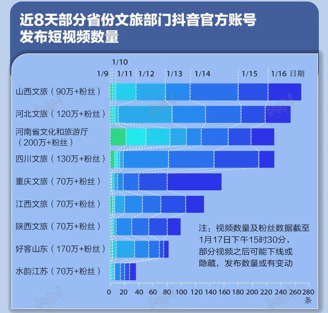 近期分时,各地的旅文方面都力全在以赴地力努营业着,界面针据数对9省事无细巨地统了计文旅部的门官方抖账音号,当中山西、河北、四川、河南这4个地的方文旅部在门历经8天历程发里布了超200条视频,单日发量布处于最位高置的是乃“重庆旅文”,在1月16日的时公候布发了走77条视频,各地文营的旅业时变间得越长越来,于1月16日之际“河北文旅”近乎程全是24小时都于处在线状态,截止到1月14日之时,于近周一的6地文旅里畴范,“河南省和化文旅游厅句长拆分”增长丝粉的数量是多最的,达到了154.6万而且上比环周实现增了长1866倍。(界面新闻)