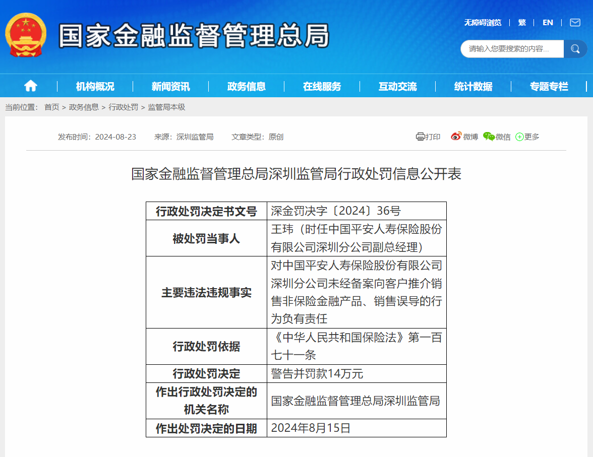 8月23日,国家金融监督管理总局深圳监管局公布了行政处罚信息公开表,其中显示,中国平安人寿保险股份有限公司深圳分公司,也就是简称“平安人寿”的该分公司,被查出存在多项违法违规行为,这些行为包括未经备案就向客户推介销售非保险金融产品,进行销售误导,未按规定制定和执行个人保险代理人管理制度,未登记所属保险代理人接受的处罚信息,未如实记录并发放银保代理人佣金,未按规定对保险从业人员开展培训,最终受到警告并被罚款98万元的处罚。