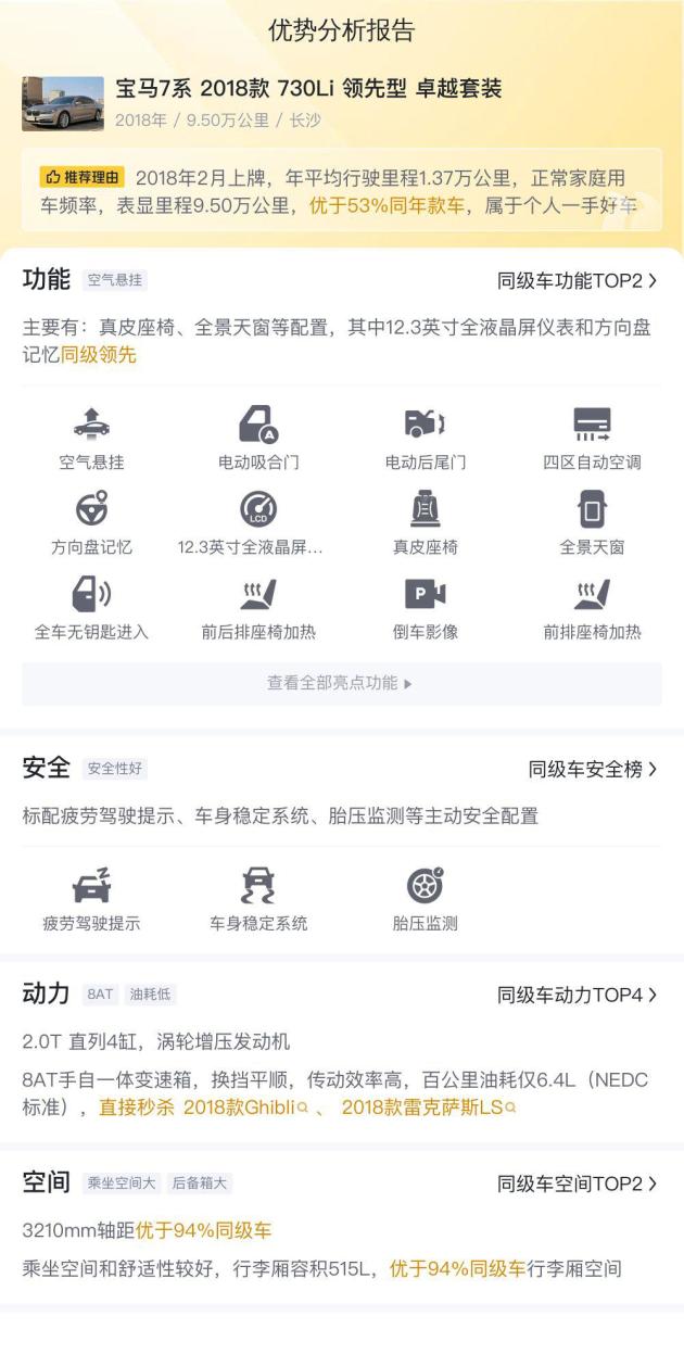 这款标注为2018款730Li领先型卓越套装的宝马7系,其最为突出的优势在于豪华内饰以及先进科技配置。身为BMW旗舰车型,7系始终代表着品牌顶级造车工艺与前沿科技。这款730Li也不例外,车内高级材质与精细做工几乎遍布各处,无论是座椅手感、中控台设计还是各种按键反馈,都让人领略到何为真正的豪华。除内饰外,该车在动力系统以及悬挂系统方面表现同样出色。2.1. 0T发动机,其排量不大,然而动力输出充沛,并且动力输出平顺,它配合ZF的8速手自一体变速箱,不管是城市巡航,还是高速超车,都能够应对自如。2. 悬挂系统,它能够在保证操控性的情况下,为乘客提供一流的舒适性。