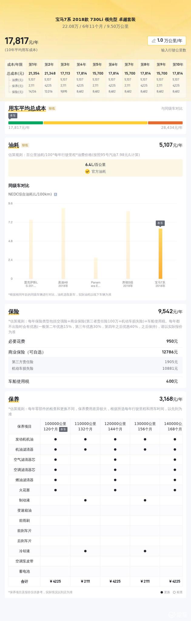 这款拥有2018款730Li领先型卓越套装的宝马7系,其用车成本处于适中状态。依据平台所展示的数据表明,此款车型百公里油耗是6.4L,要是以每年行驶2万公里来计算,那么每年所需的油费大概是11465元。在保险费用这一块,每年大约为13440元,它对车辆以及驾驶者的安全起到了保障作用。而保养费用方面呢,每年大概是6318元,这保证了车辆的性能以及寿命。除此之外,该车型存在某些瑕疵以及需要留意的事项。在底盘、发动机等方面或许存在一些问题,在购买之前一定要进行全面的检查和评估。